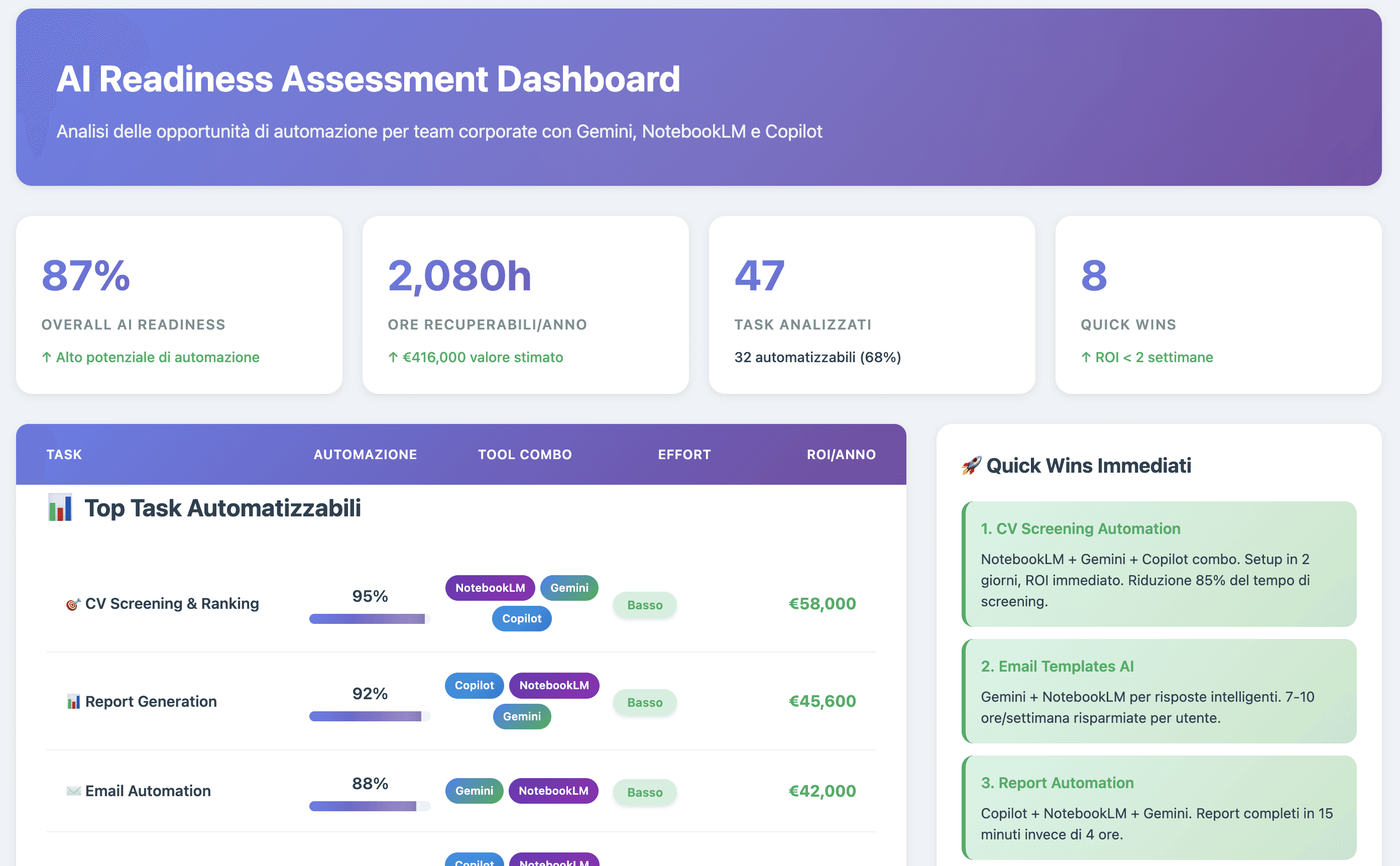 Sviluppo piano AI su 18 mesi con use case prioritizzati per ROI, business case dettagliato e framework di governance.