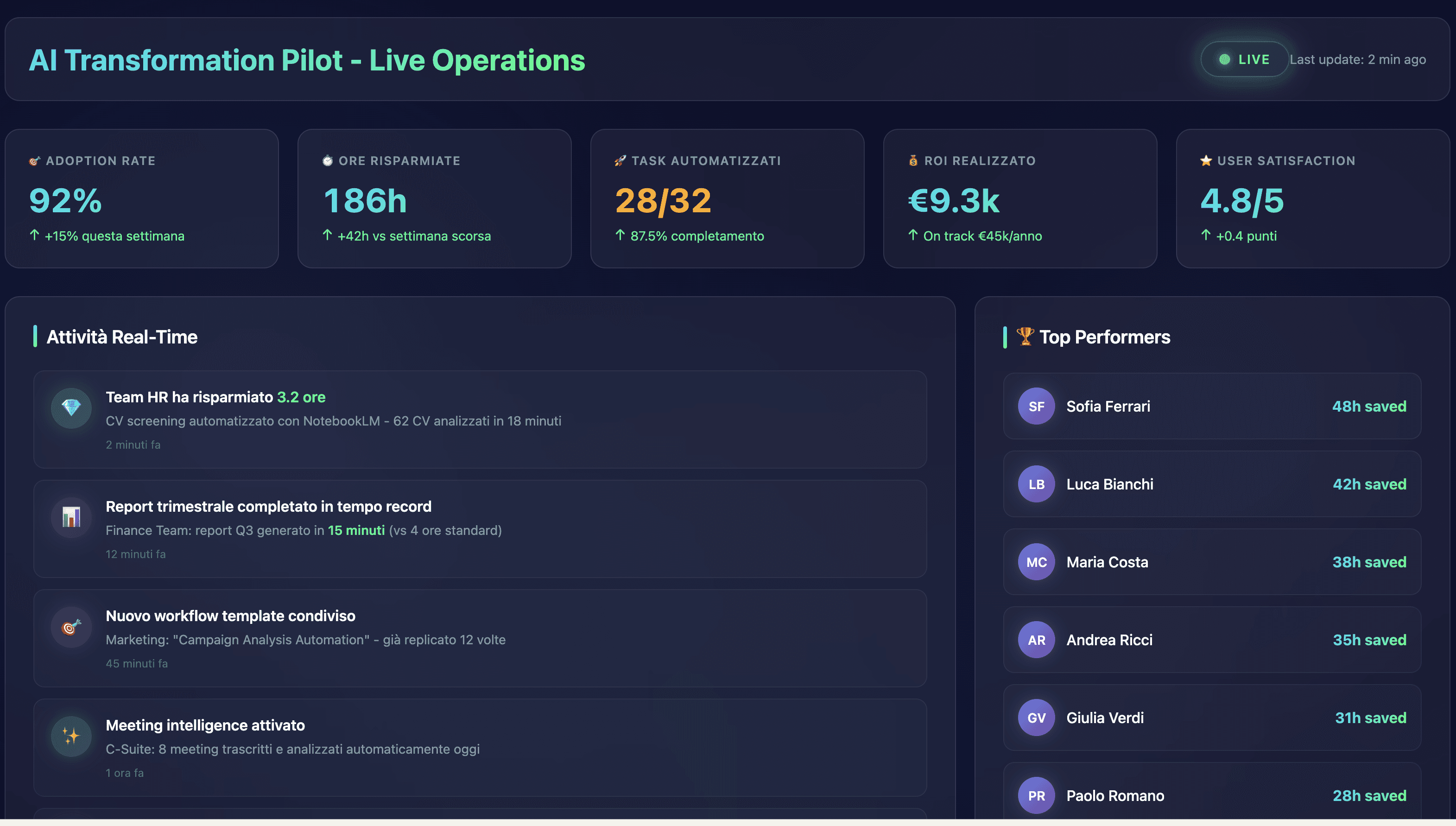 Espansione delle soluzioni validate, creazione di AI Center of Excellence interno e capability building per innovazione continua.